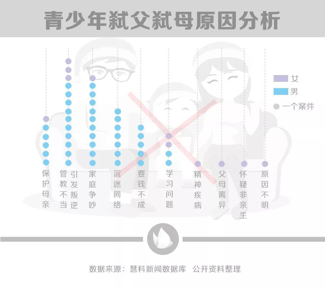 在所有男性青少年弑父弑母暴力案件中,有一半的犯罪行为是因管教不当和争吵而引发。其次引发男性弑父弑母的犯罪行为的因素是“沉迷网络”、“保护母亲”和“要钱不成”。